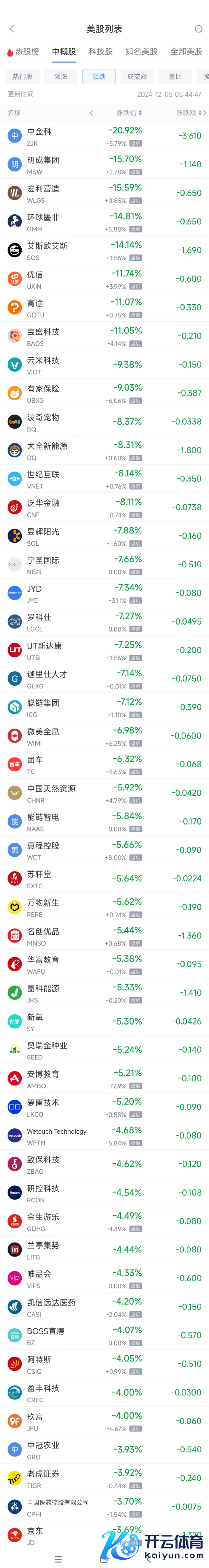 领跌中概股列表: