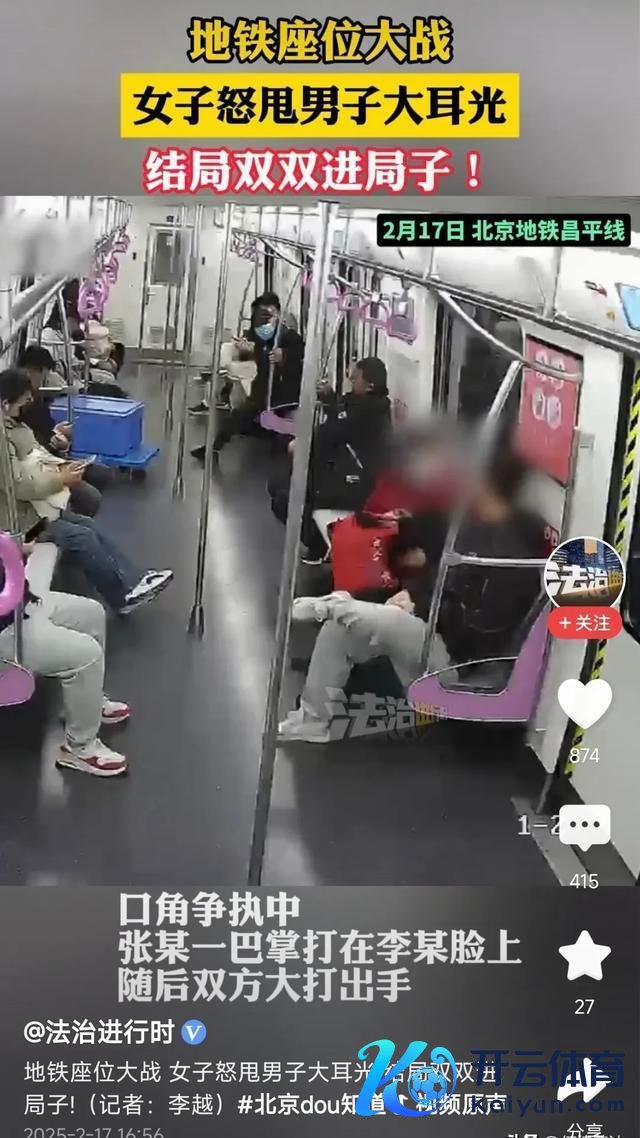 声明:本文实质均援用采集而已皆集个东说念主不雅点进行撰写欧洲杯体育,请悉知。 无意候,突破经常从一件小事运转,比如一个座位的包摄问题。北京地铁昌平线上,一场小小的座位纠纷,硬是被两位乘客演绎成了一场“拳脚交锋”。女子先是一巴掌扇以前,须眉也出头出面,凯旋回敬。最终,两边谁也没能占到低廉,双双被拘留罚金。 这事儿一出,网友炸开了锅:先动手的怎样和还手的处罚一样?是不是以后谁动手都算互殴? 事情发生在北京地铁昌平线。别称41岁的女子张某在搭车时,为了多占一个座位,把我方的包放在掌握的空座上。另别称
