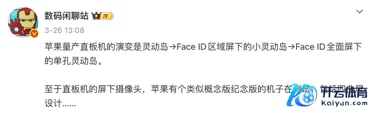 阐发博主@数码闲说念站 的爆料,iPhone 直板机的屏幕演变流程是:灵动岛→小灵动岛→单孔灵动岛,最终宗旨是已毕前摄和 Face ID 全面屏下的真全面屏计算。